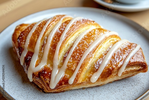 Croissant with drizzled icing on plate with coffee cup in the background, for breakfast
