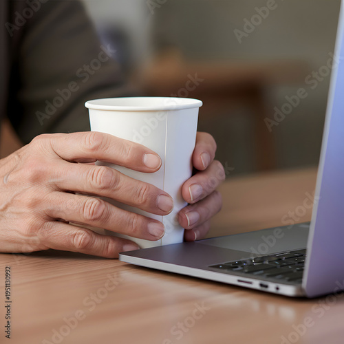 Cropped hands holding disposable cup by laptop at table