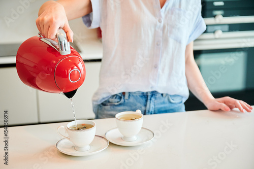 Cropped picture of woman pouring water into cup. Young female making tea for two. Woman holding red kettle over two cups.