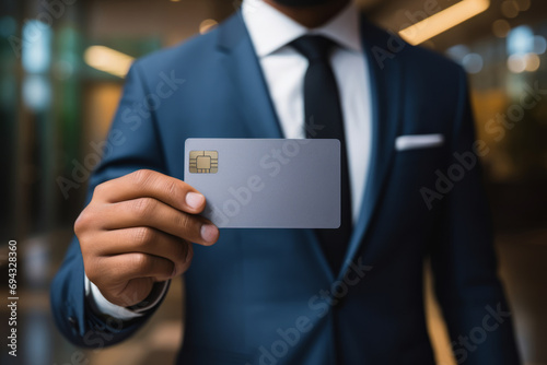 Cropped portrait of a businessman in a dark formal suit and tie, holding a bank card in his hand in front of him. Successful entrepreneur uses a credit card. Cashless payment concept. Mockup.