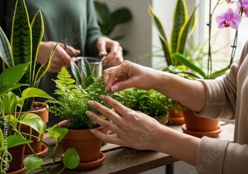Cropped shot of a woman’s hands tending to potted plants in an urban botanical setting, showcasing home gardening and green living – sustainable lifestyle and indoor plant care concept