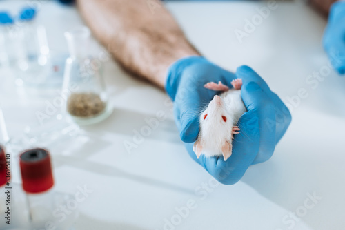 cropped view of veterinarian in latex glove holding white mouse near test tubes