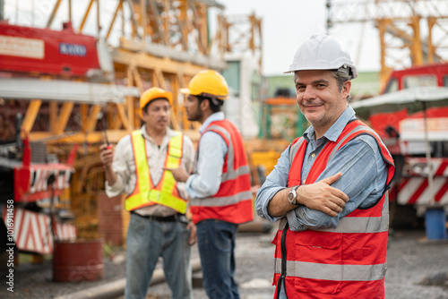 Cross arm Mature caucasian engineer man worker with team and spare crane background