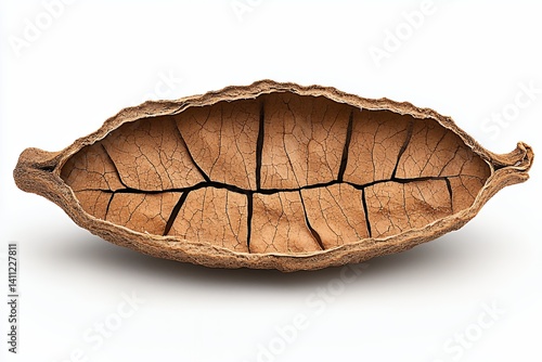 Cross Section of a Dried Fruit Pod Featuring Cracks and Mosaic Pattern on White