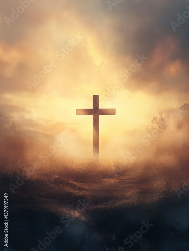 Cross Silhouette on Misty Hill at Dusk Symbolizing Faith and Hope