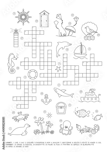 Crossword puzzle. Sea theme. Game and Coloring page. Danish language. Vector illustration.