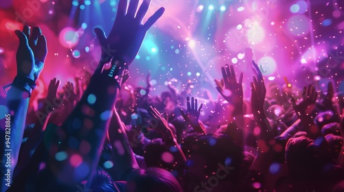 Crowd of people dancing in a nightclub with colorful lights and confetti