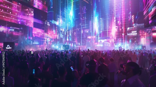 Crowd under neon lights, bokeh effect and beautiful mind visuals, rave atmosphere