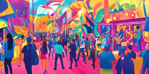 Crowded street scene with vibrant colors.