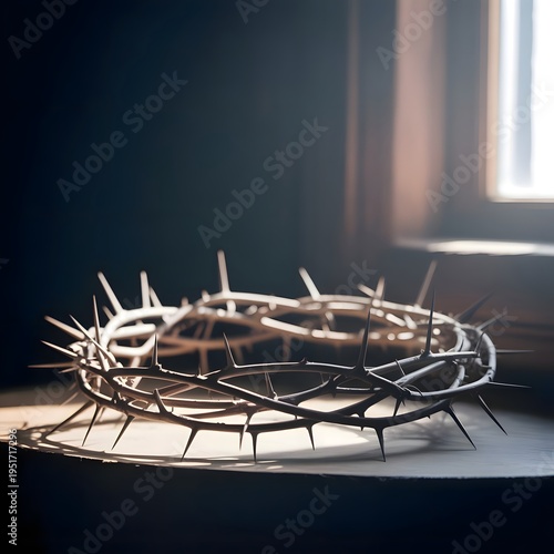 Crown of Thorns on a wooden surface with soft window light, symbolizing sacrifice, suffering, and religious devotion, ideal for Easter and spiritual themes.