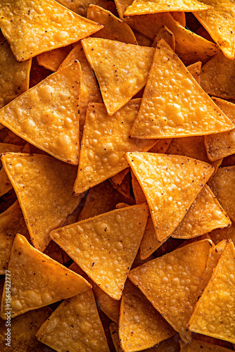 Crunchy triangular nacho chips with golden texture and seasoning, macro and full-frame texture shot, close-up texture, top view