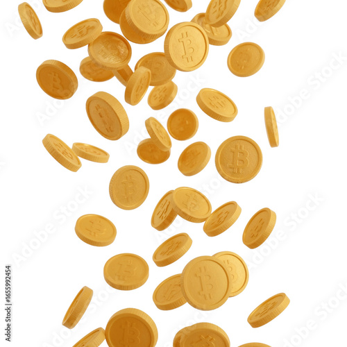 Cryptocurrency Rain: A Golden Cascade of Digital Bitcoins Falling on a Transparent Isolated Plain