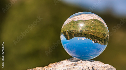 Crystal ball alpine landscape shot at Zauchensee, Salzburg, Austria