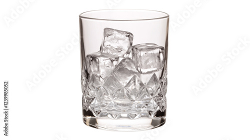 Crystal whiskey glass containing ice cubes on transparent background