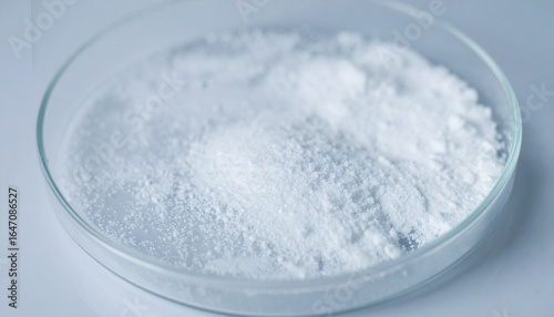 Crystalline salt particles scattered in petri dish on white background. Laboratory chemistry.