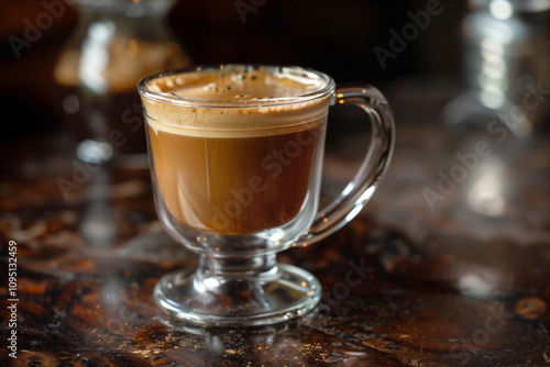 Cuban coffee in clear glass mug, selective focus