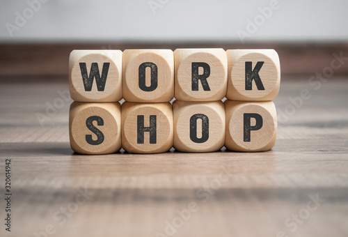 Cubes or dice with word Workshop on wooden background