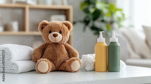 Cuddly teddy bear sits next to baby bottles and neatly arranged nappies on a table, illuminated by natural light against a white backdrop