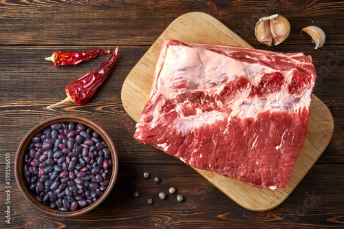 Culinary ingredients: raw pork belly, red beans, garlic, peppercorns, hot peppers on a dark wooden rustic background.