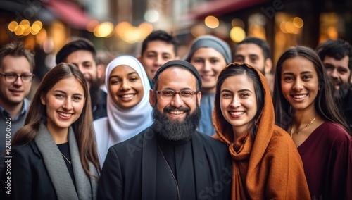 Cultural harmony: diverse figures, spiritual unity, smiling faces, global connection, interfaith respect, inclusive representation, human solidarity, shared values, multicultural community.