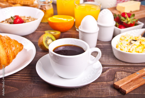 Cup of coffee, juice, eggs, fruits, toasts. Breakfast concept.
