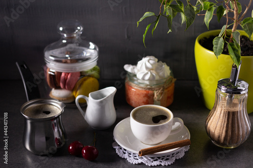 Cup of coffee on table background. Set of coffee and sweets food ingredient