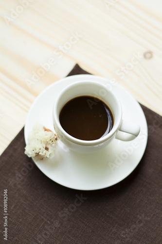 Cup of coffee on a brown tablecloth