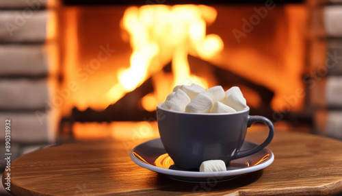 Cup of hot chocolate topped marshmallows, placed by warm crackling fireplace. Autumn or winter