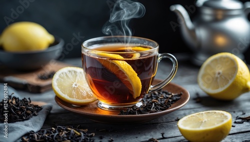 Cup of steaming black tea with lemon slice on wooden plate with loose tea leaves and fresh lemons in a cozy breakfast setting