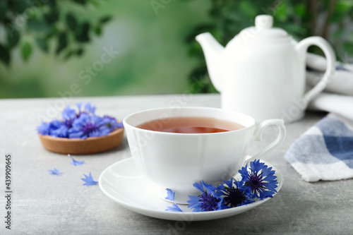 Cup of tea and cornflowers on light table