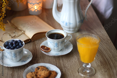 Cup of tea or coffee, plate of cookies, cup of blueberries, plate of chocolate, glass of juice, book, reading glasses, teapot, flowers and lit candles on the table. Brunch or afternoon tea concept.