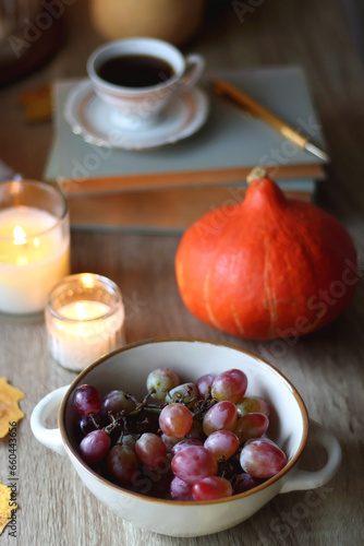 Cup of tea or coffee, plate with desserts, dried oranges, bowl of grapes, scented candles, vintage books, pumpkins and autumn leaves on the table. Autumnal hygge. Selective focus.
