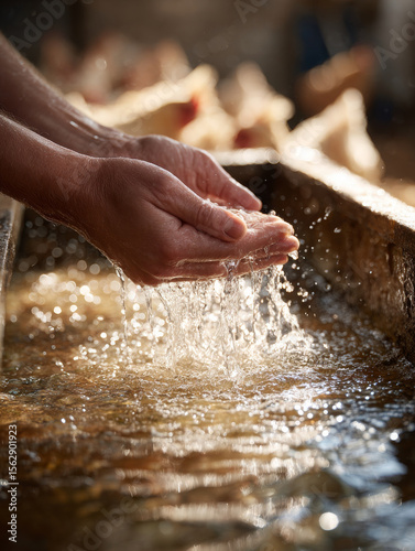 Cupped hands gently pouring clean water into trough, creating ripples of tranquility