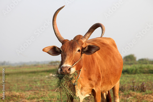 Curious cow eating grass at the field