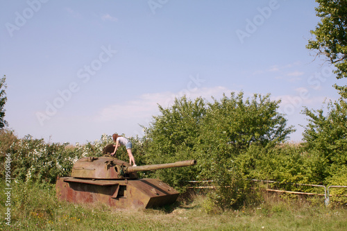 curious girl explores an old rusty tank