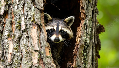 Curious Raccoon Peeking Out From Inside a Tree Trunk's Hollow