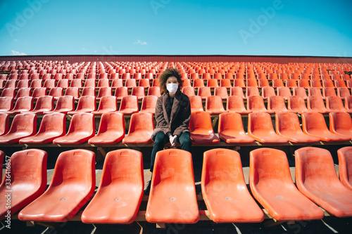 Curly girl in a surgical mask sitting in an empty stadium during epidemic disease Covid-19.