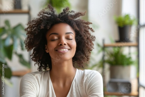 Curly-haired woman smiling by window