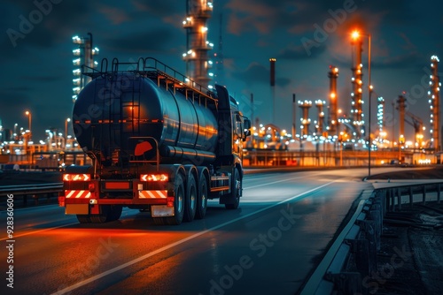 Curry fuel truck on highway transporting fuel to petrochemical oil refinery at night