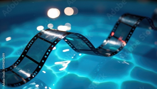 Curved cinematic film strip swimming in blue liquid with swirling reflections, liquid, film strip, curved