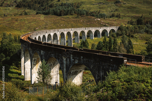 Curved Glenfinnan Viaduct concrete railway bridge in the Scottish Highlands