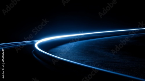 curved motion streak with blue trail and glowing line across the dark road, as the laser beam breaks into light and a bright tail forms the main moving line