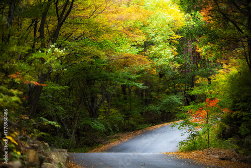 Curving Forest Road Through Dense Woodland in Autumn Landscape