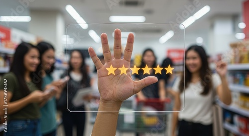 Customer Hand Showing Four Star Rating Over Blurred Shoppers in Supermarket Aisles