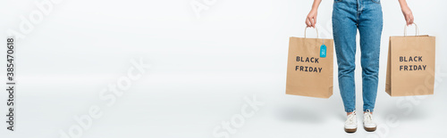 customer holding shopping bags with sale tag and black friday lettering isolated on white, panoramic shot