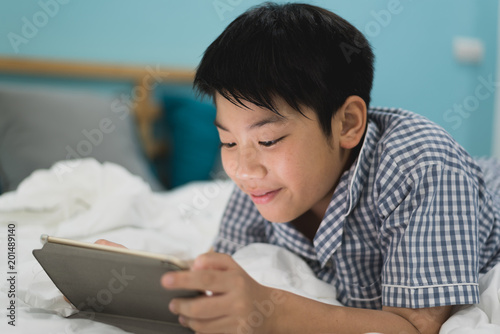 Cut boy lying on the bed with a table. Child playing with digital tablet lying on a bed.