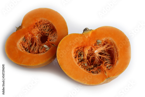 Cut in half Musque de provence or fairytale orange pumpkin isolated on white background. Cucurbita moschata on white