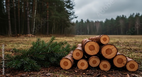 Cut Logs Stacked with Evergreen Branch in Forest Landscape