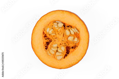 Cut open 'Baby Bear' Halloween pumpkin showing vegetable meat and seeds inside. Isolated on white background
