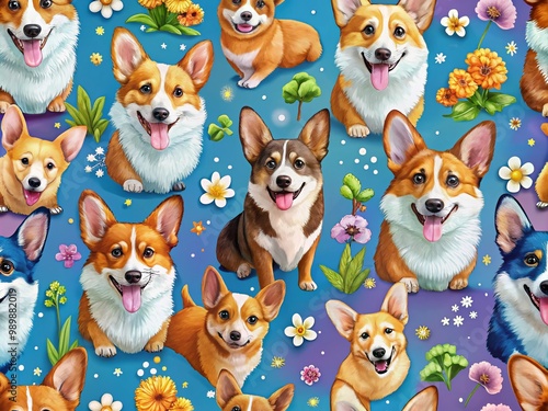 Cute and Colorful Corgi Pattern with Playful Dogs in Various Poses on a Bright Background Design